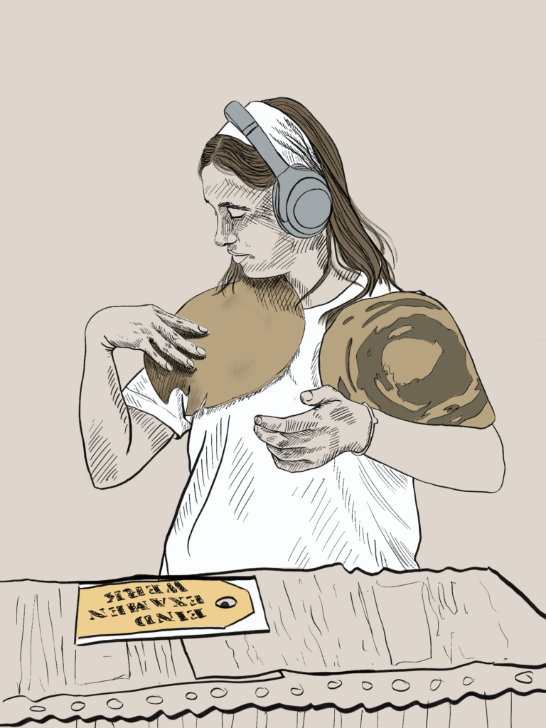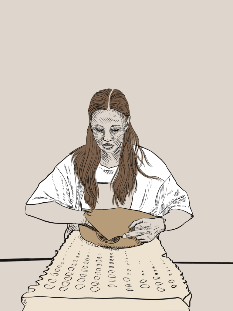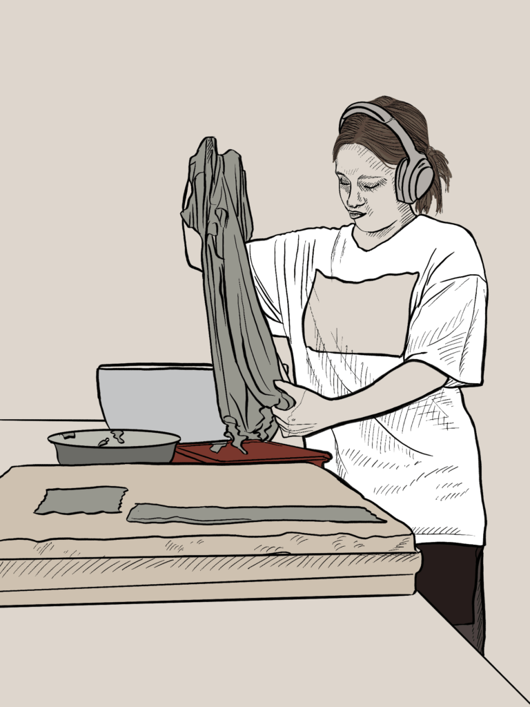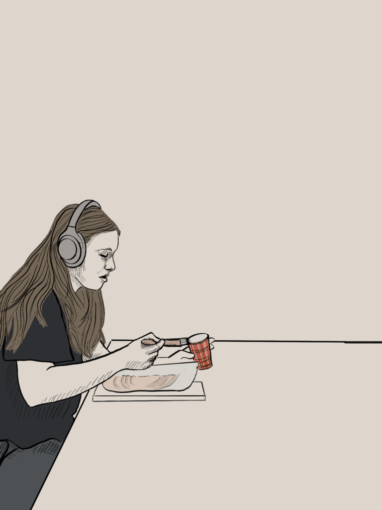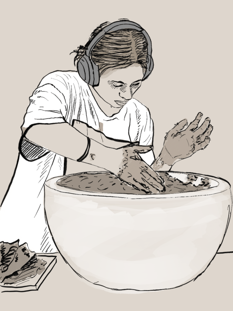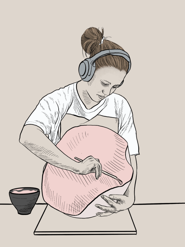 Ik zit in het lokaal Berlijn. Een mooie ruimte met veel licht, een podium bij het raam en verder een lege kamer. En ik mag die zelf helemaal inrichten. Ik heb sculpturen en tekeningen. Daarnaast ben ik er door gesprekken met zowel docenten als studenten achter gekomen dat ik mijn ruimte wil inrichten zoals het werk mij heeft laten voelen. Troostend. Welke ruimte is voor mij troostend? Het keramieklokaal. Maar ik kan niet het lokaal transformeren naar keramieklokaal.