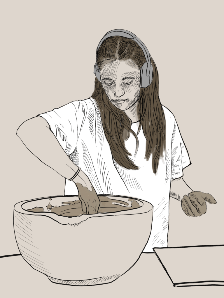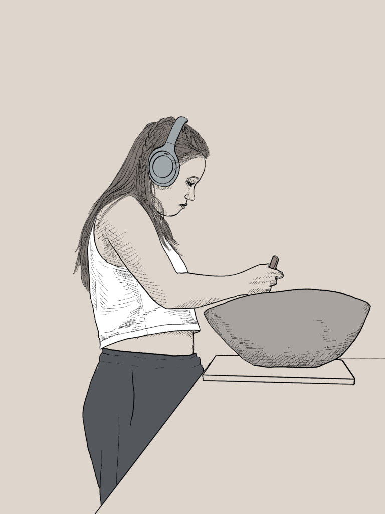 Het idee is dat ik de ruimte inricht alsof het een werkruimte is waar ik zo verder in zou kunnen werken. Dus ik leg ook klei neer, klaar om te gebruiken. Ik zet een mal van gips neer, zo een waar ik ook mee heb gewerkt. Ik leg mijn gereedschap neer dat ik van mijn vader voor sinterklaas heb gekregen. Om het plaatje af te maken, leg ik een oude koptelefoon neer.