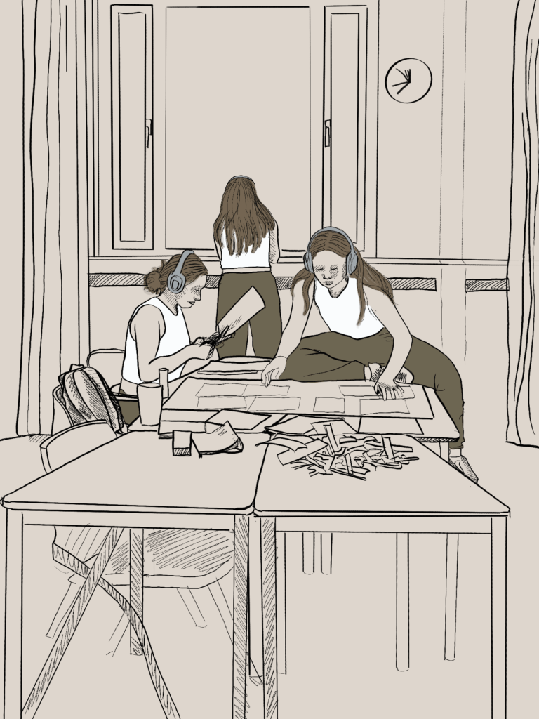 Wat wil ik nog meer? De tekeningen wil ik aan de muur hebben. Dat is niet zo lastig, dat kan ik met plakband doen. Het papier moet dun zijn, zodat het voelt als schetspapier. Het proces is immers nooit echt klaar. Daarnaast zijn de tekeningen begonnen als iets voor mezelf. Als ik ze zelf zou printen, zou dat waarschijnlijk ook op een normale kantoorprinter zijn. Aan de hand van een gesprek met Oskar ga ik wel nog even experimenteren met de manier van ophangen. Wil ik de tekeningen plat op de muur? Of moeten ze er van loskomen? Wat vind ik er beter uitzien? Dat weet ik denk ik pas als ik het zie, dus dat moet gaan afhangen van de opbouw week.