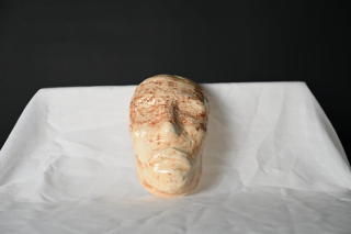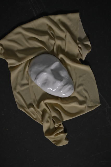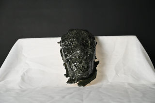 Dit werk is van Pamela Olson. De kunstenares ken ik verder niet, maar ik kwam dit werk tegen. Wat mij interesseerde is het werk is de vorm. De manier waarom het lijkt als het een “natte doek” is die gewoon is opgedroogd. Ik heb dit bij twee maskers ook geprobeerd.