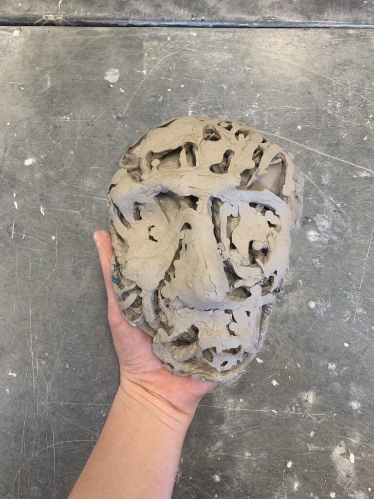 De eerste serie gezichten die ik heb gemaakt in de mal, zijn met fijne chamotte en heb ik gedrukt in de mal. Er is een masker dat de basis vorm heeft, maar bij de andere maskers heb ik vooral geëxperimenteerd met de manieren van het indrukken van de klei en het vervormen van het masker. ik begon een beetje “braaf”, maar hoe meer ik aangereikt kreeg van Lot en medestudenten, hoe meer ik ook probeerde buiten mn comfortzone. (en ook buiten de mal).