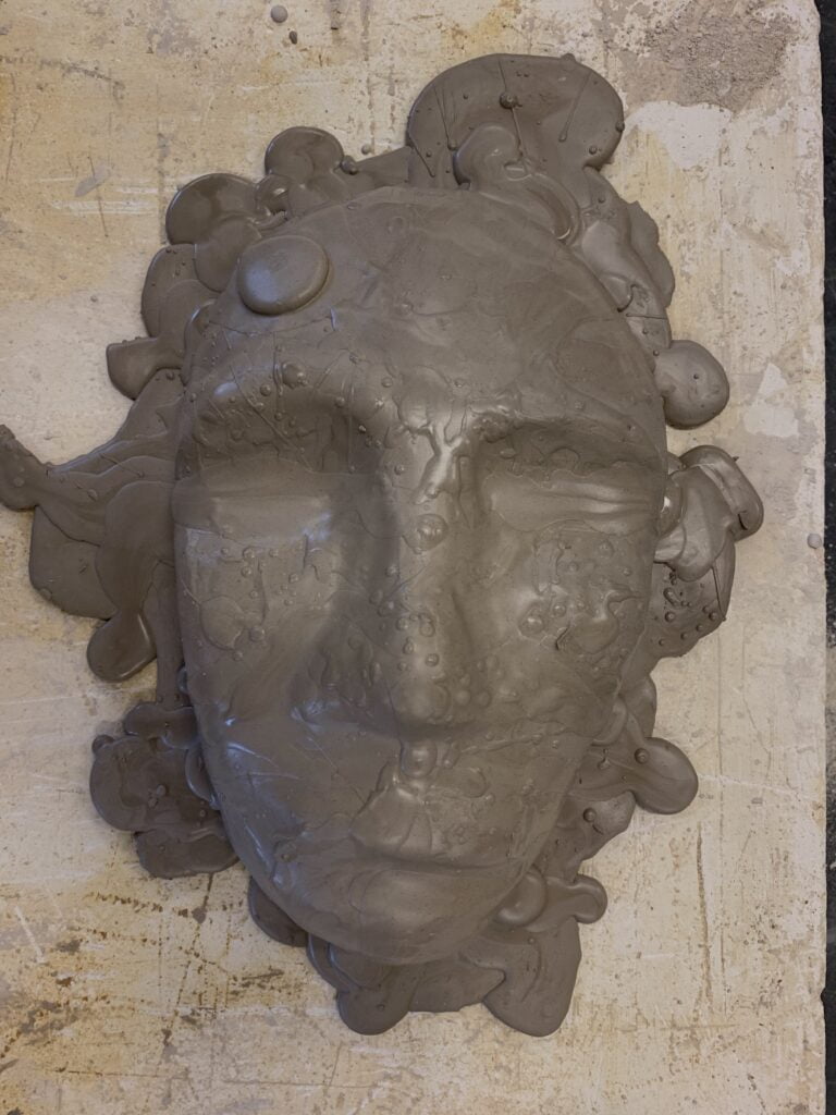 Ik heb ook heel veel met gietklei geëxperimenteerd. Wederom heb ik ook een masker gemaakt zonder er verder iets aan te hebben aangepast. Ook met gietklei heb ik verder dingen uitgeprobeerd. Ik heb verschillende stukjes stof in gietklei gedoopt en in de mal gelegd. daardoor zijn sommige maskers wel heel fragiel, maar ze zien er ook heel interessant uit. Ook heb ik een kleurpigment gemengd in de klei en daarmee gegoten.